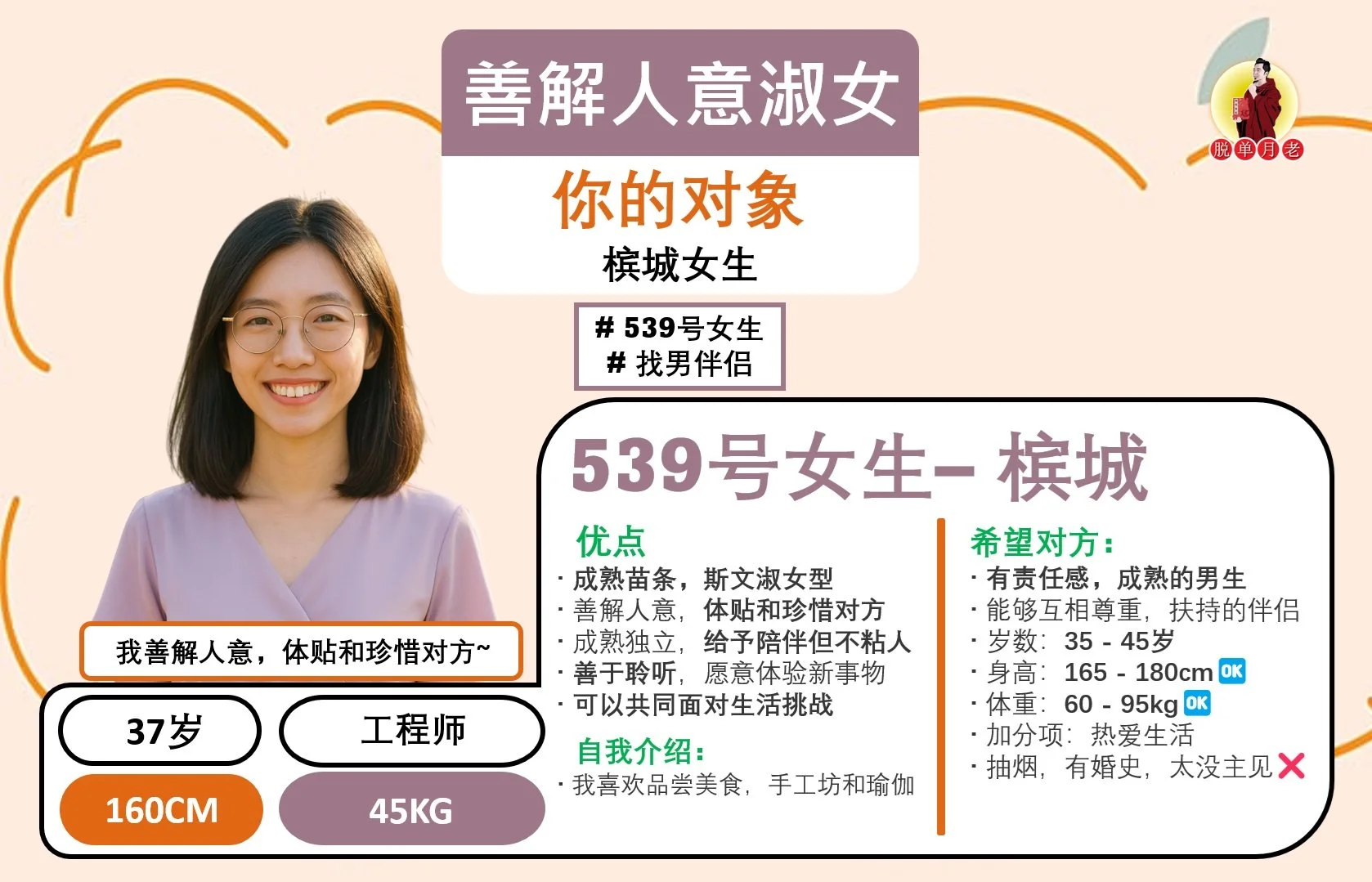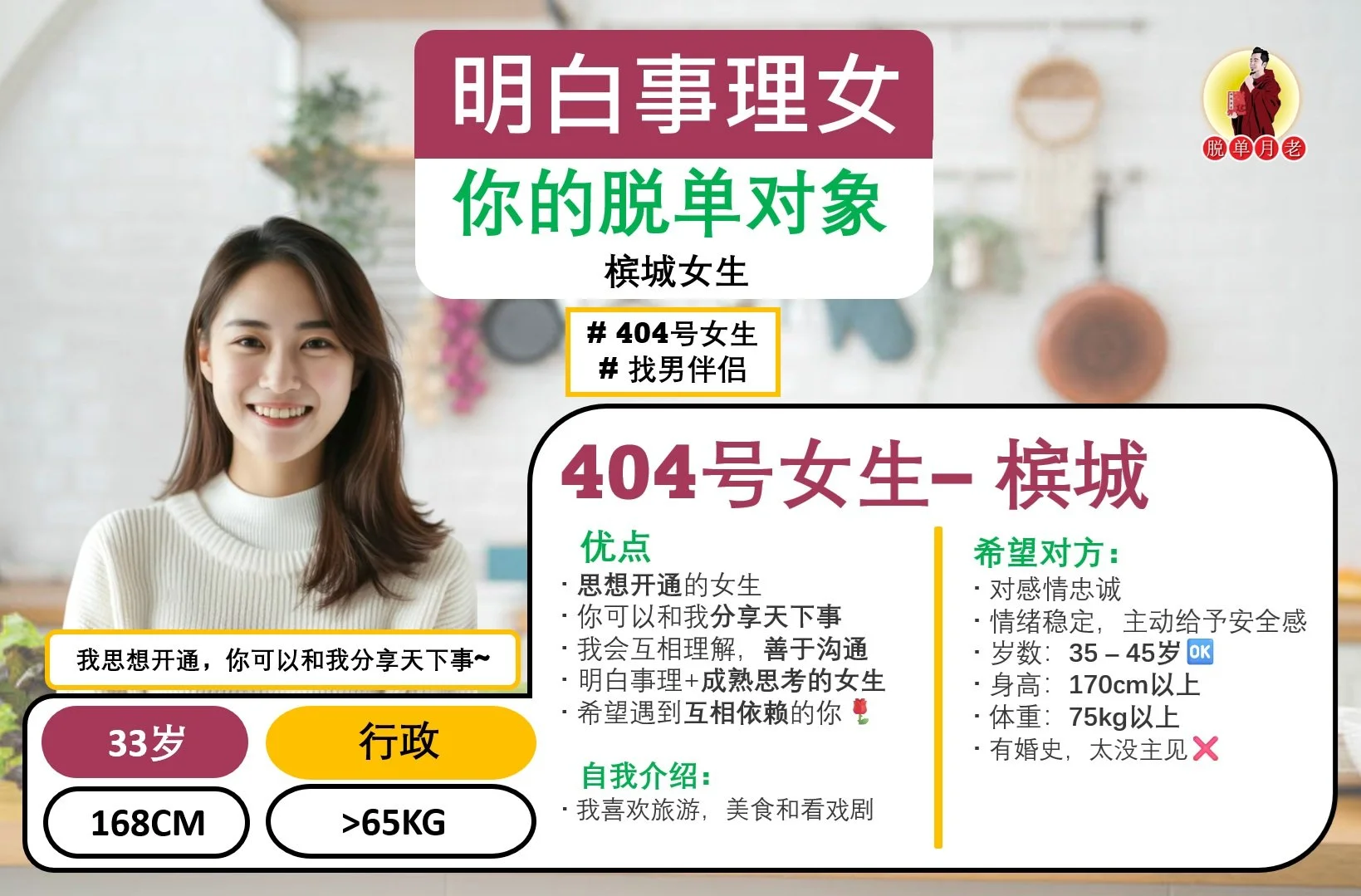 #脱单月老 #大马相亲公司 #配对服务 #姻缘 #全马 #编号404 #你的脱单对象 #明白事理女 #槟城 #找男伴侣 #33岁 #行政