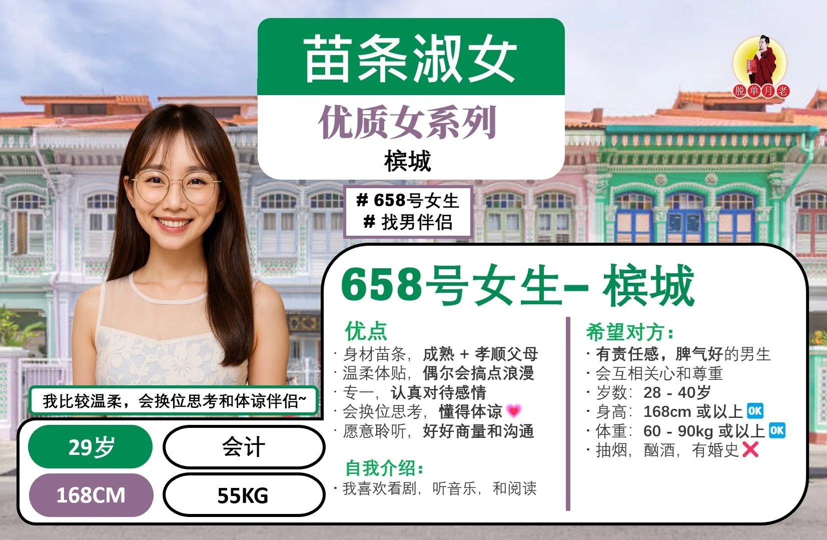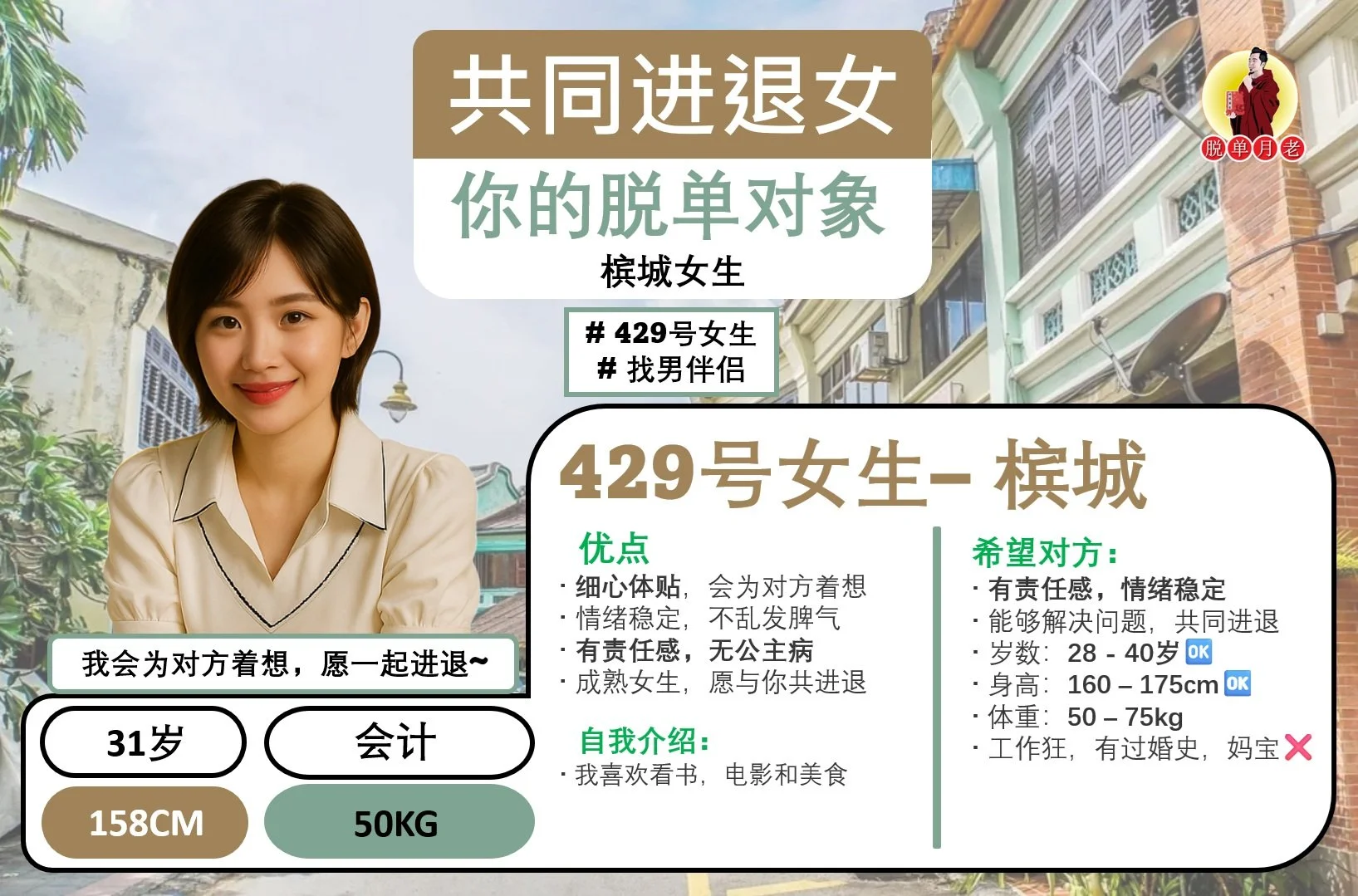 #编号429 #你的脱单对象 #槟城 #温柔体贴 #共同进退女 #找男伴侣 #31岁 #会计