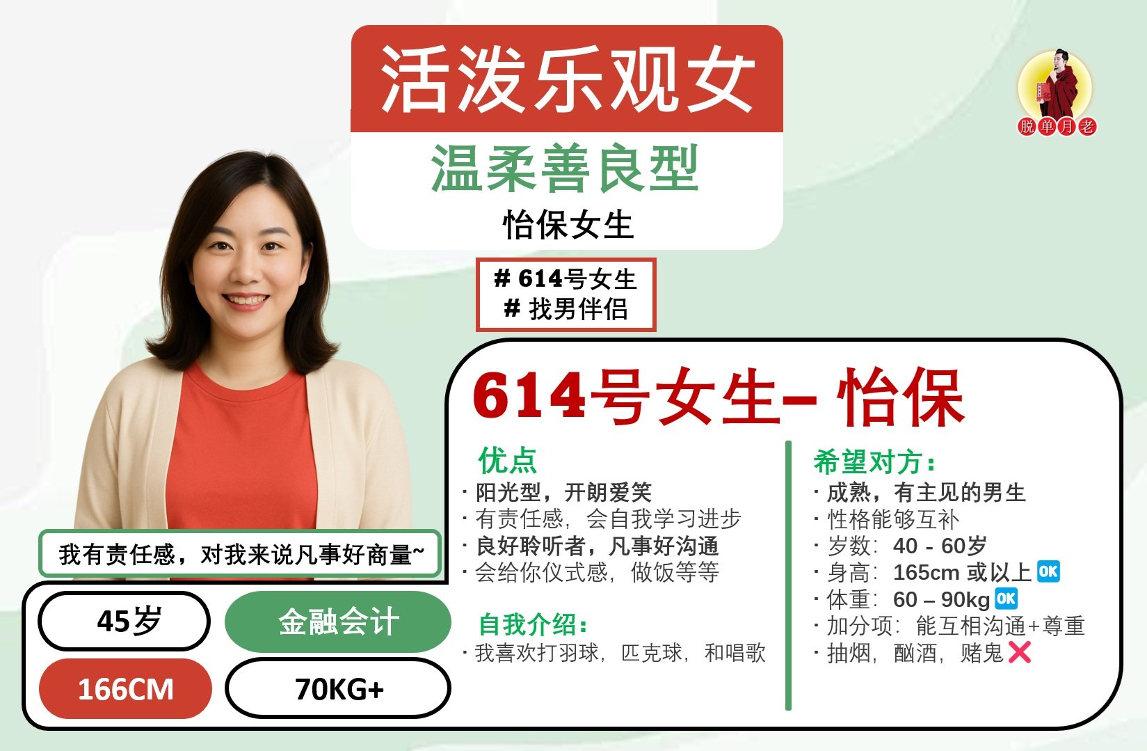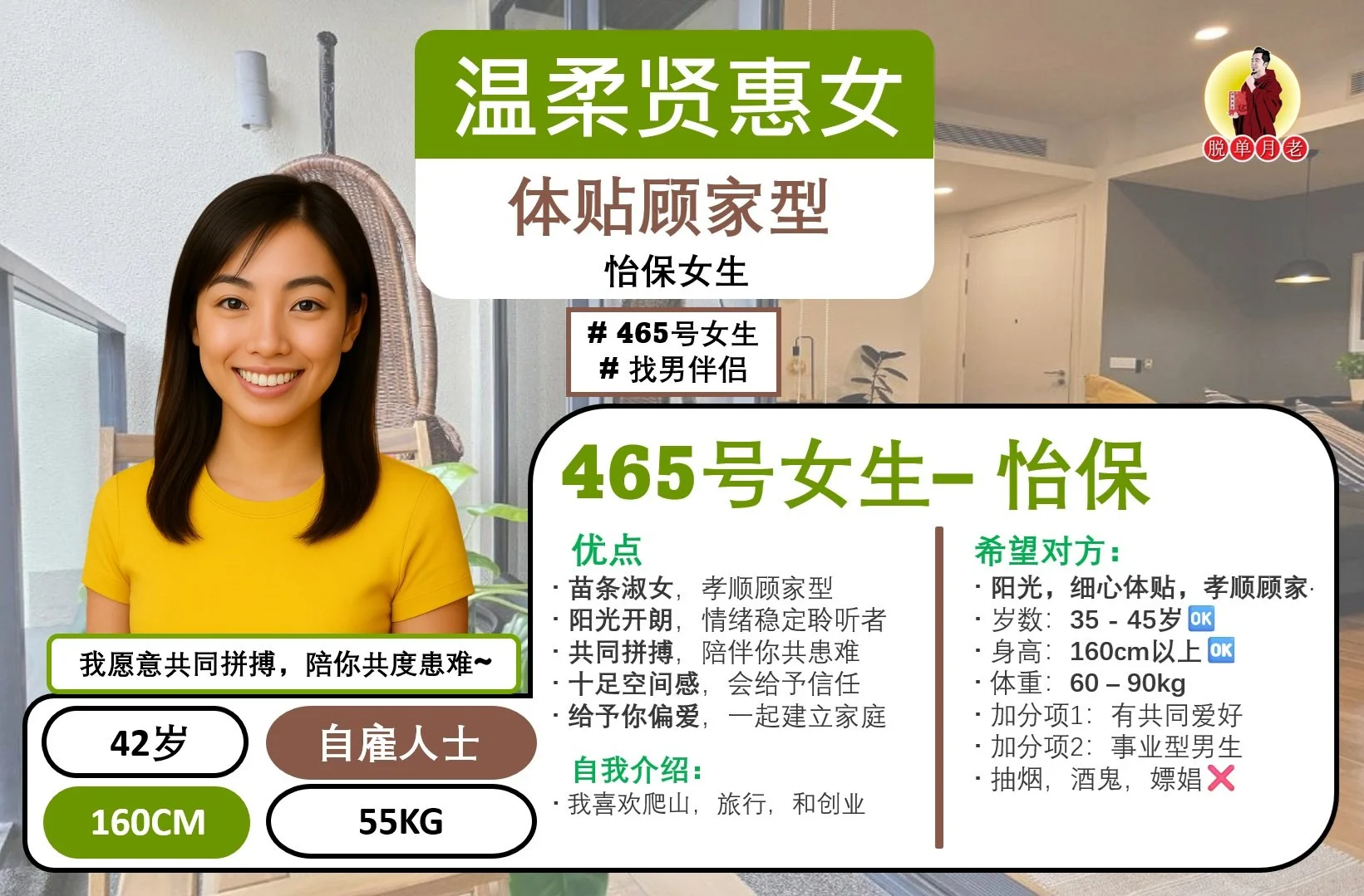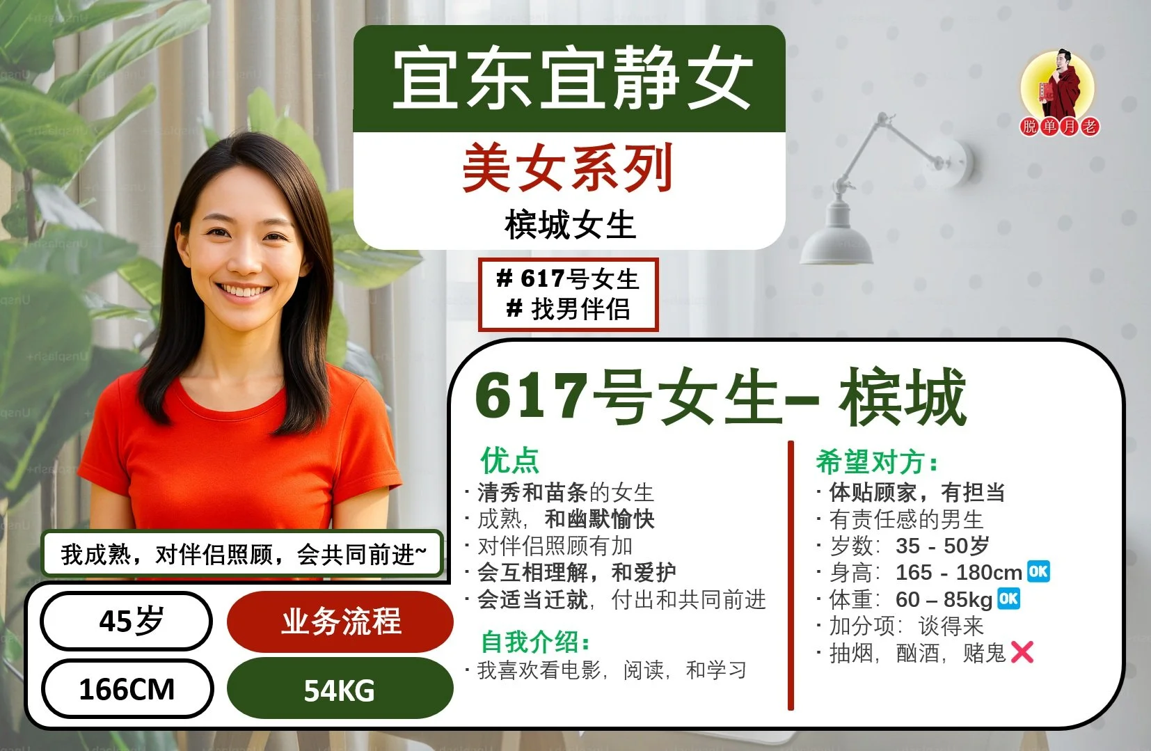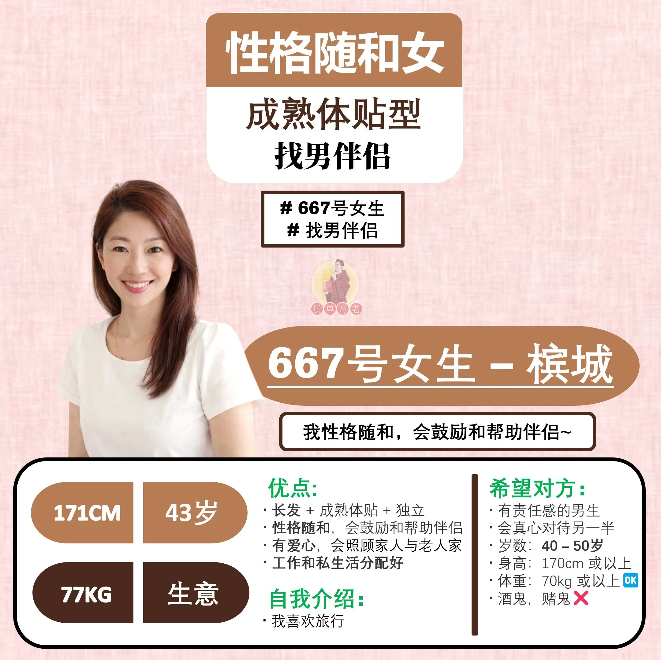 #脱单月老 #大马 #相亲公司 #配对服务 #脱单 #姻缘 #全马新 #编号667 #你的脱单对象 #槟城 #成熟体贴 #性格随和女#找男伴侣 #43岁 #自己的生意
