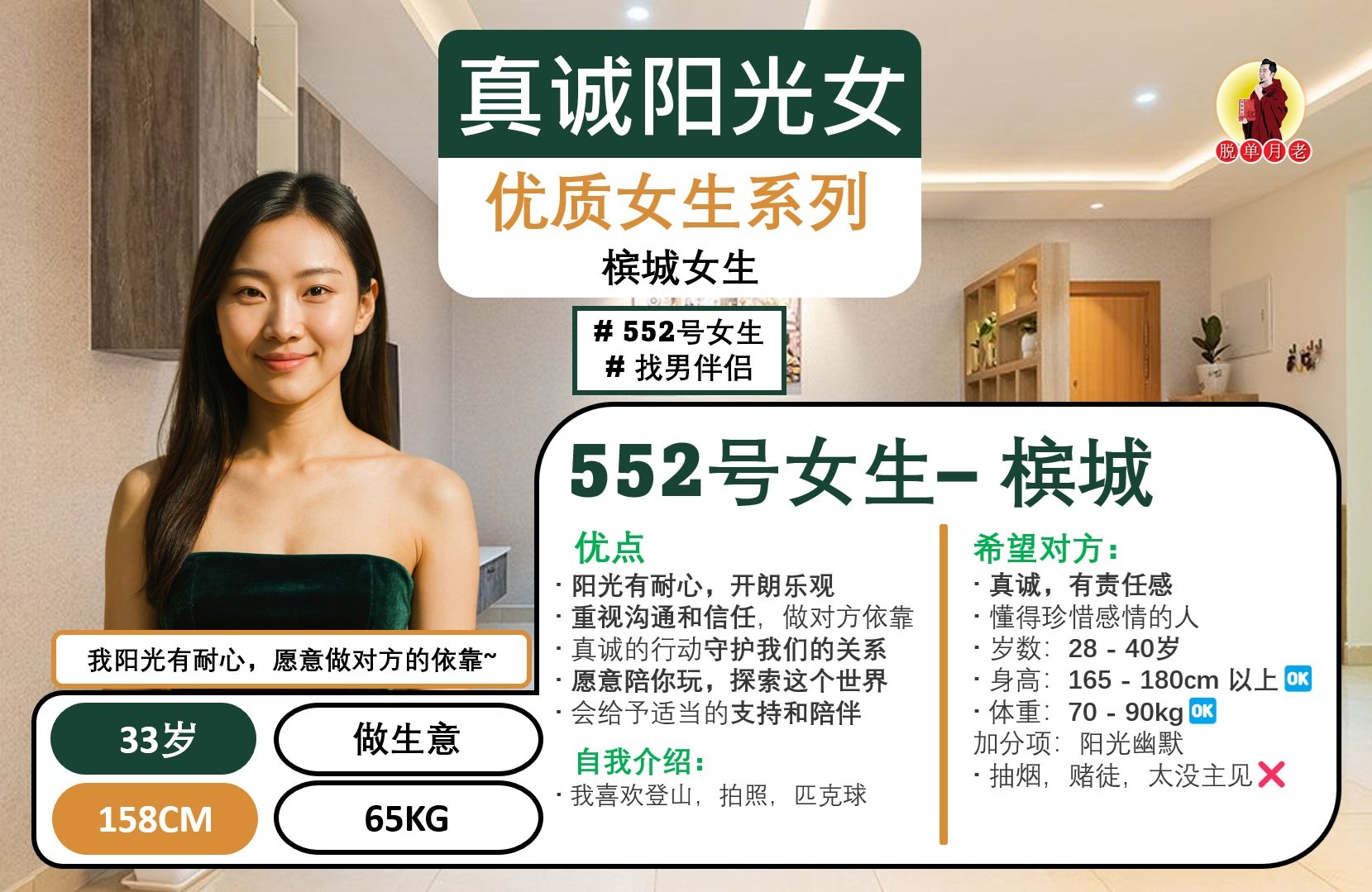 #脱单月老 #大马 #相亲公司 #交友脱单平台 #配对服务 #吉打 #槟城 #霹雳 #雪兰莪 #吉隆坡 #森美兰 #马六甲 #柔佛 #彭亨 #沙巴 #新加坡 #编号706 #你的脱单对象 #优质美女 #槟城 #阳光开朗 #真诚乐观美女 #找男伴侣 #34岁 #创业者