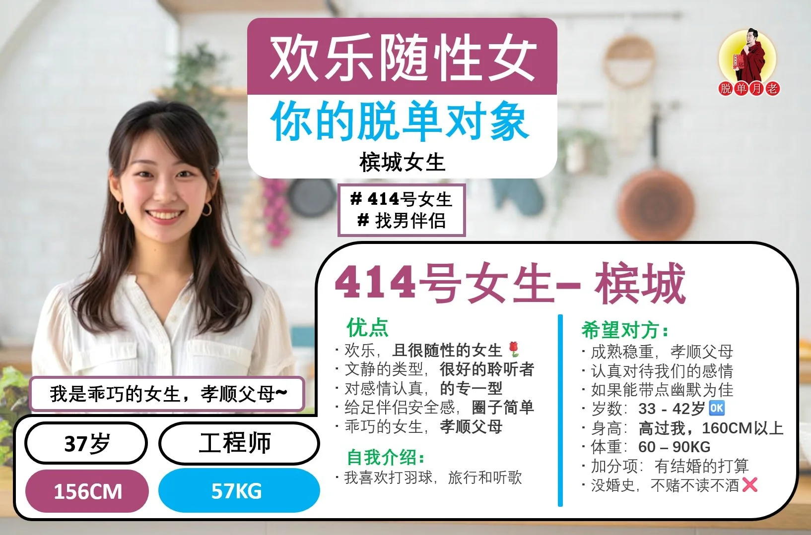 #编号414 #你的脱单对象 #槟城 #欢乐随性女 #找男伴侣 #37岁 #工程师