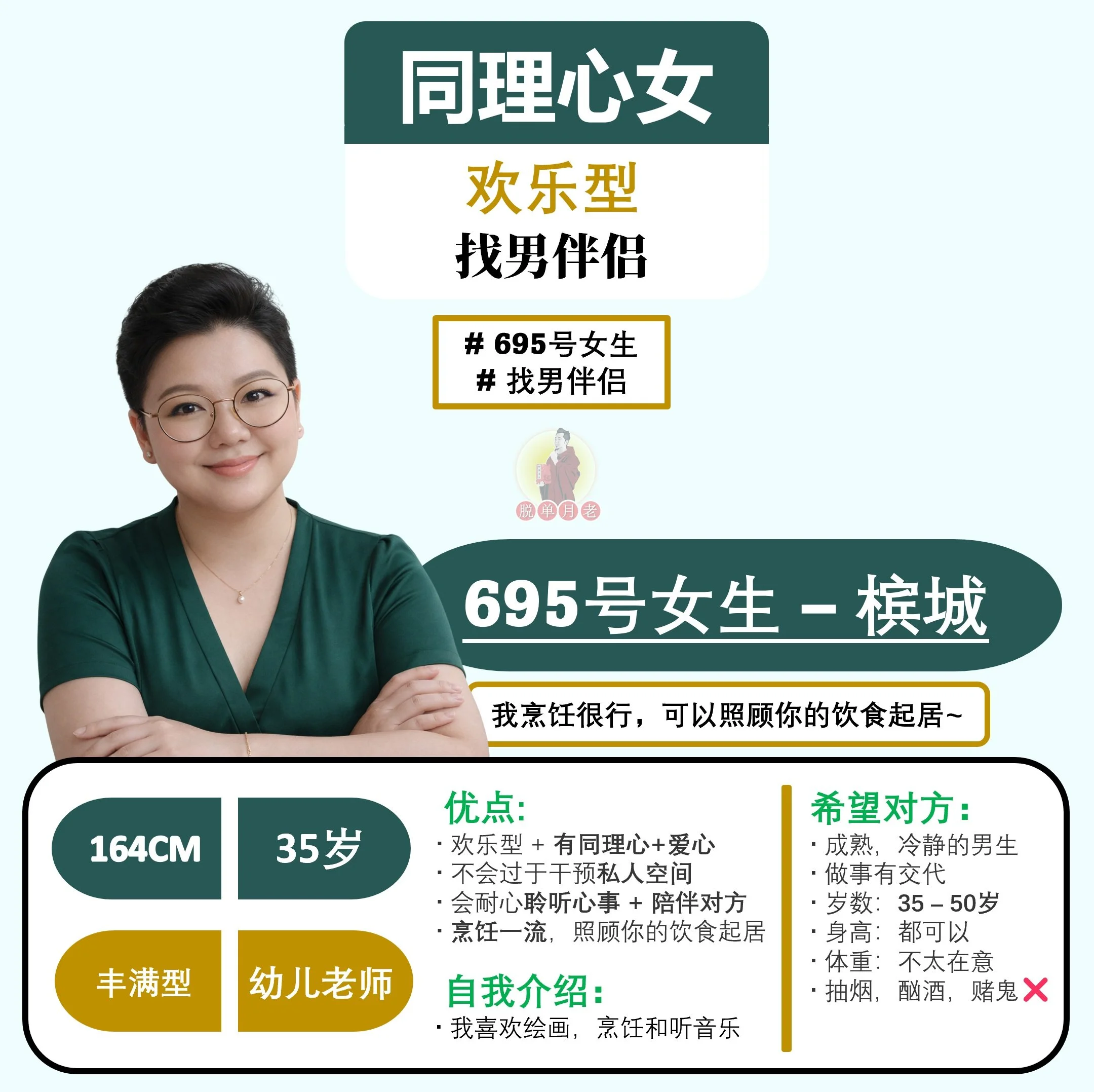 #脱单月老 #大马 #相亲公司 #交友脱单平台 #配对服务 #全马 #编号695 #你的脱单对象 #槟城 #大山脚 #欢乐型 #富有同理心女 #找男伴侣 #30岁 #幼儿园老师