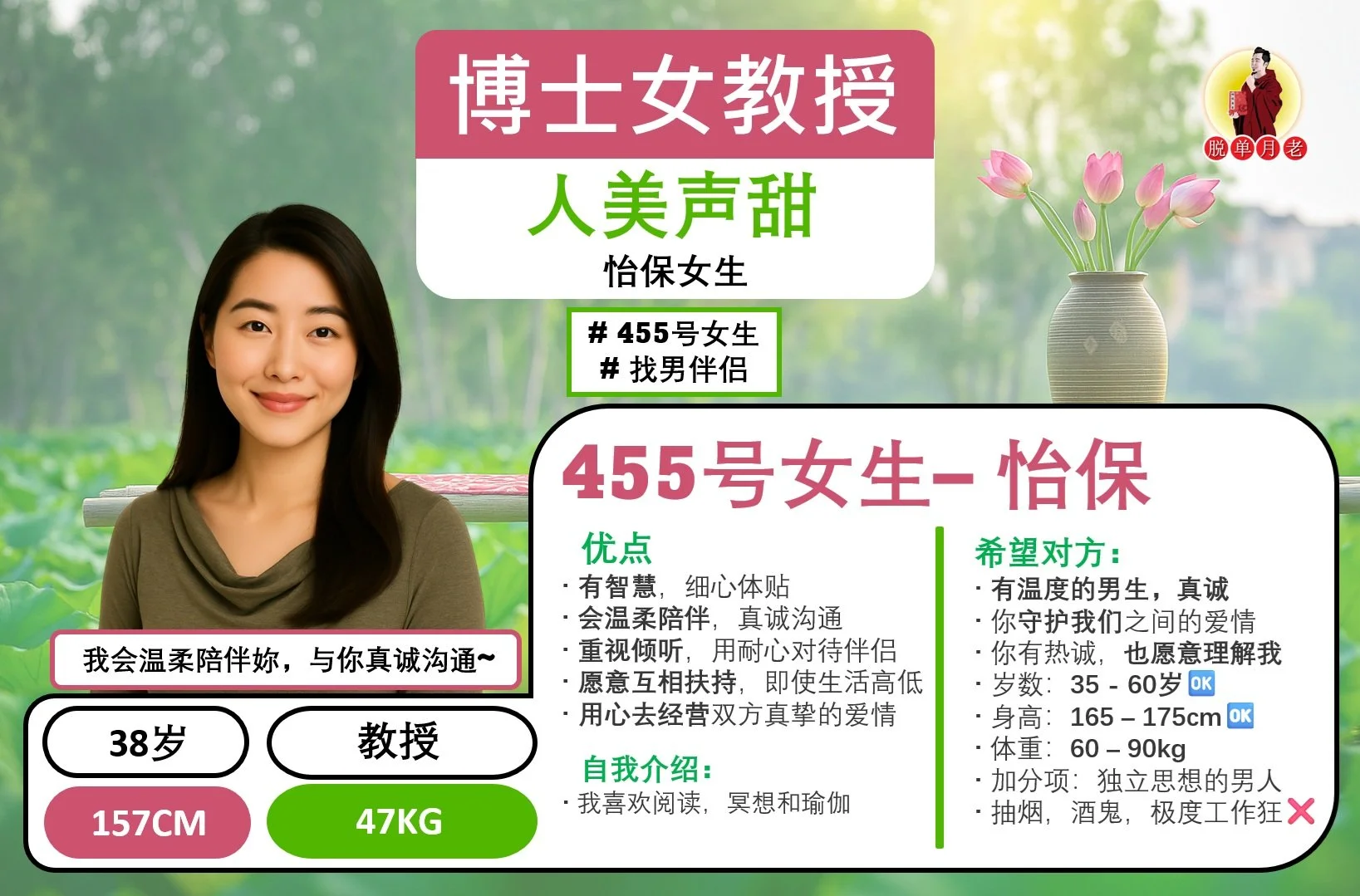 #脱单月老 #大马相亲公司 #配对服务 #姻缘 #吉打 #槟城 #霹雳 #雪兰莪 #吉隆坡 #森美兰 #马六甲 #柔佛 #沙巴 #新加坡 #编号455 #你的脱单对象 #520精选系列 #怡保 #人美声甜 #苗条淑女 #博士女教授 #38岁 #lecturer