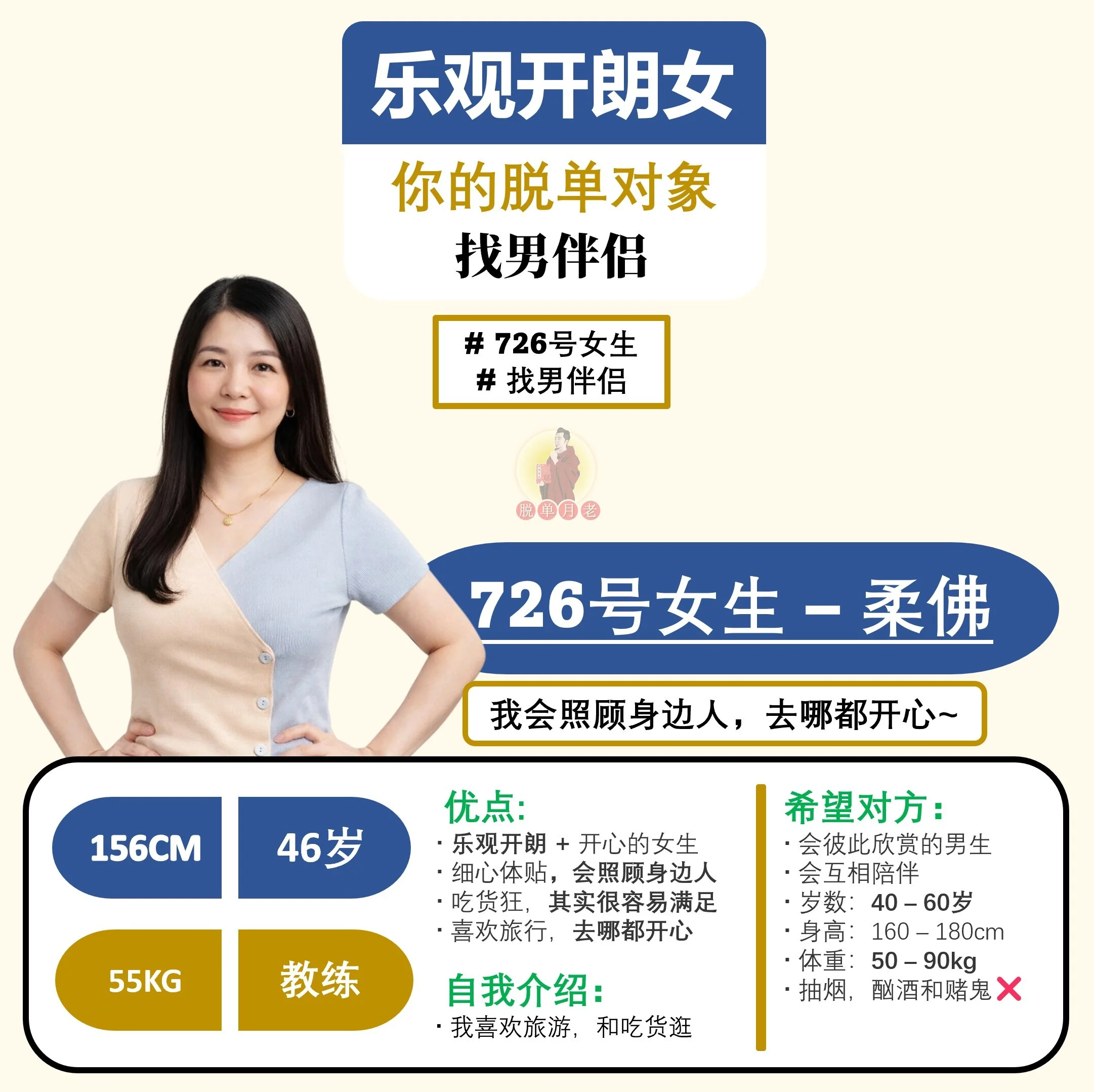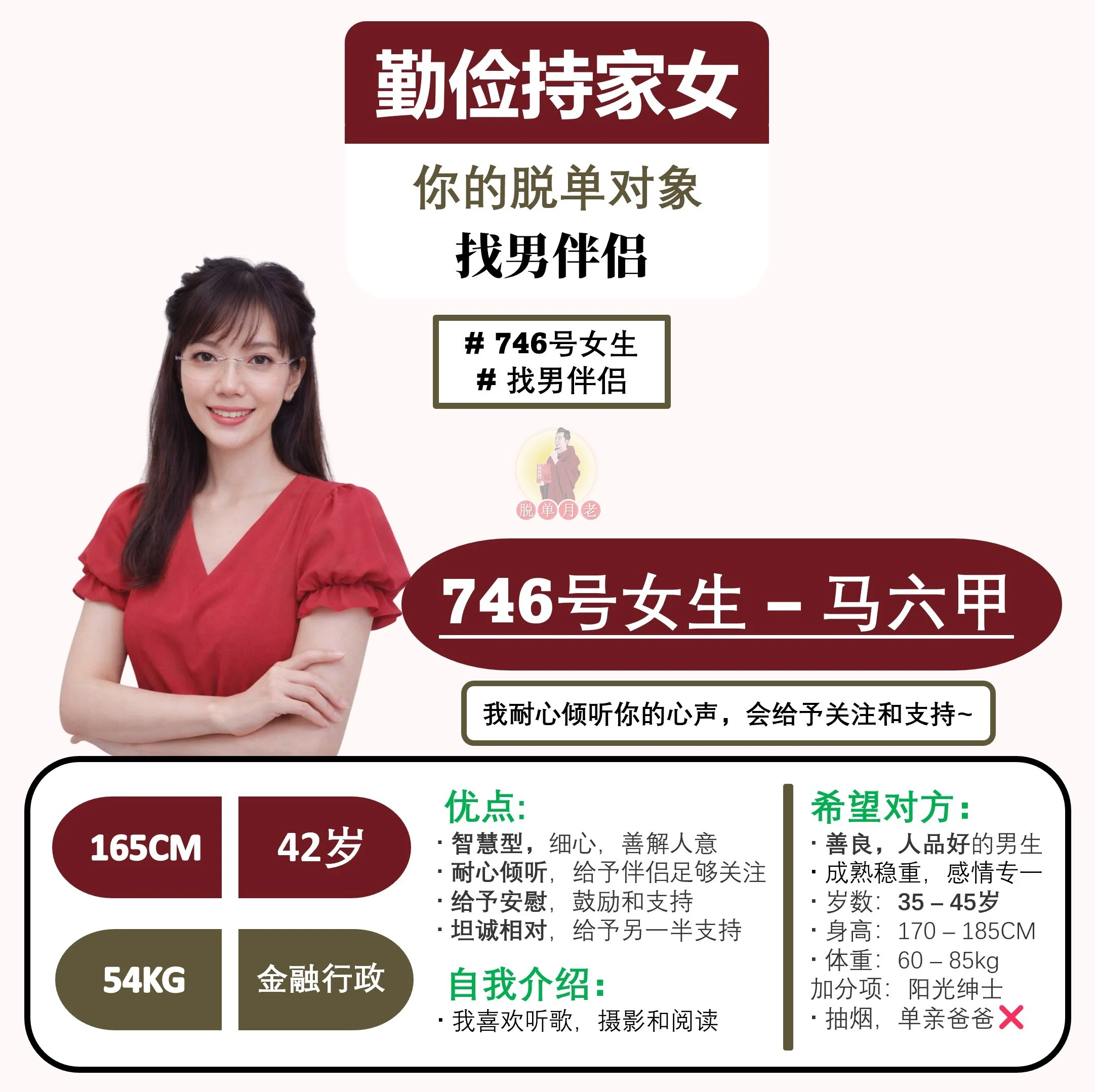 #脱单月老 #大马 #相亲公司 #交友脱单平台 #配对服务 #雪兰莪 #吉隆坡 #编号759 #你的脱单对象 #雪兰莪 #成熟心细女 #找男伴侣 #40岁 #自雇