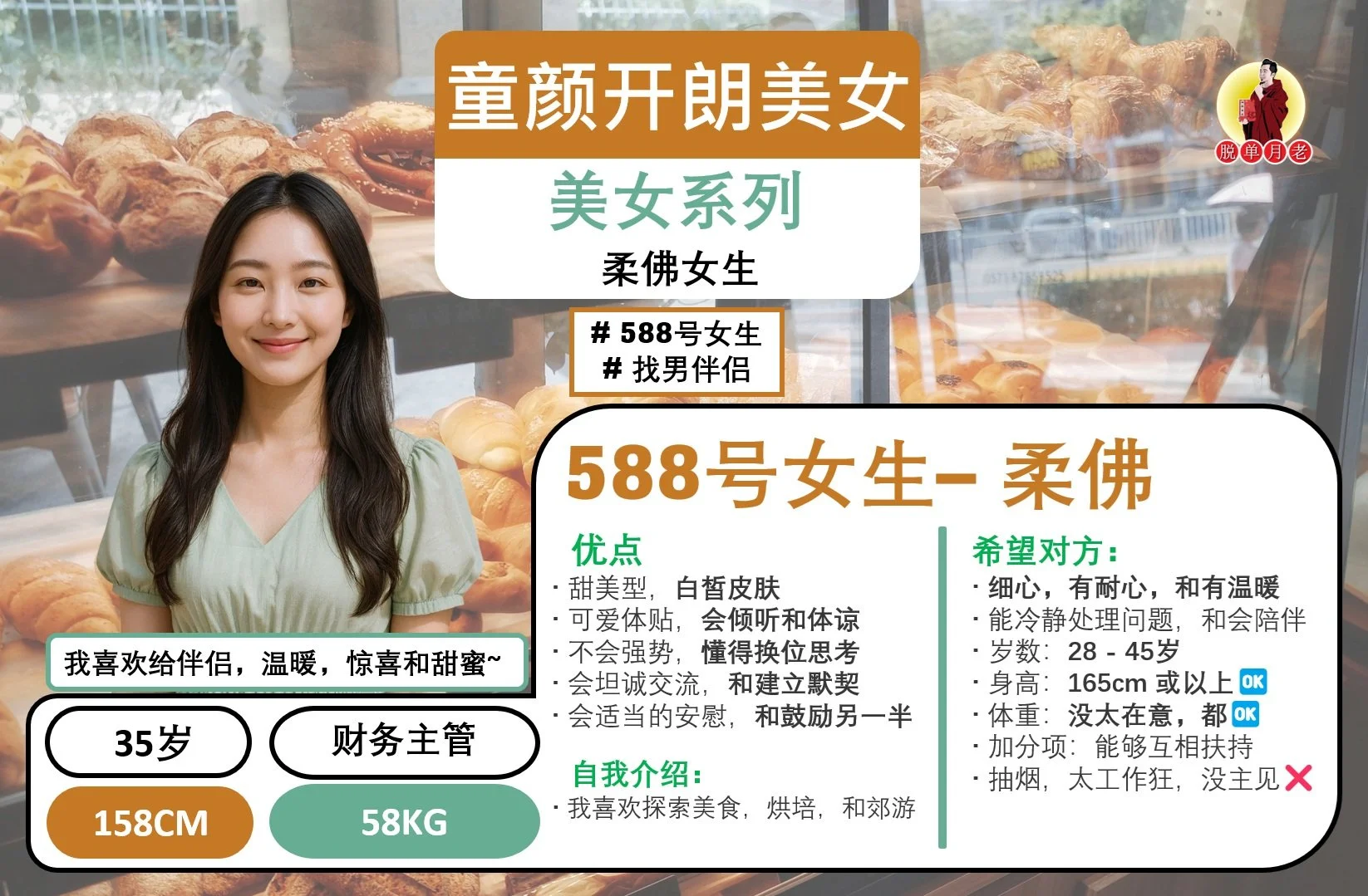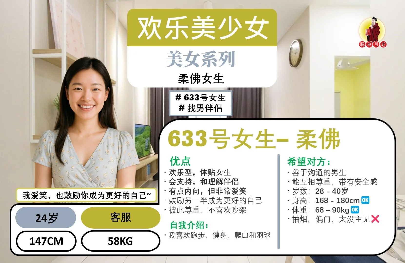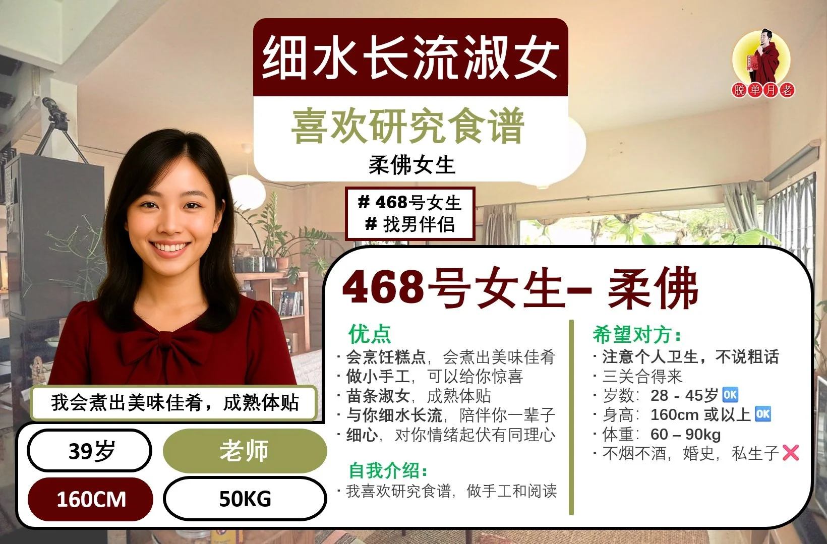 这位女主是一位大学生,佛教徒,目前在一家公司的财政部门工作,有自己的车和房。她喜欢打羽球🏸,也喜欢旅游🧳。最重要的是,她烹饪一流👩🍳,煮什么都好吃😋