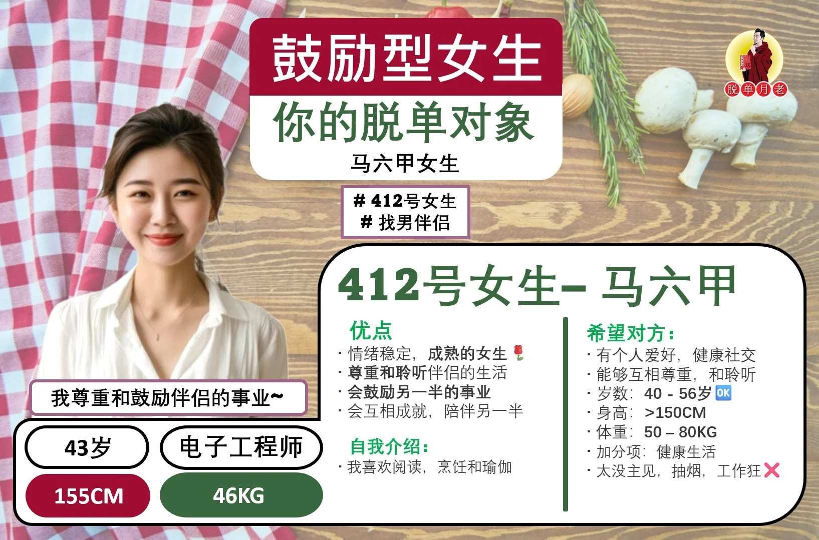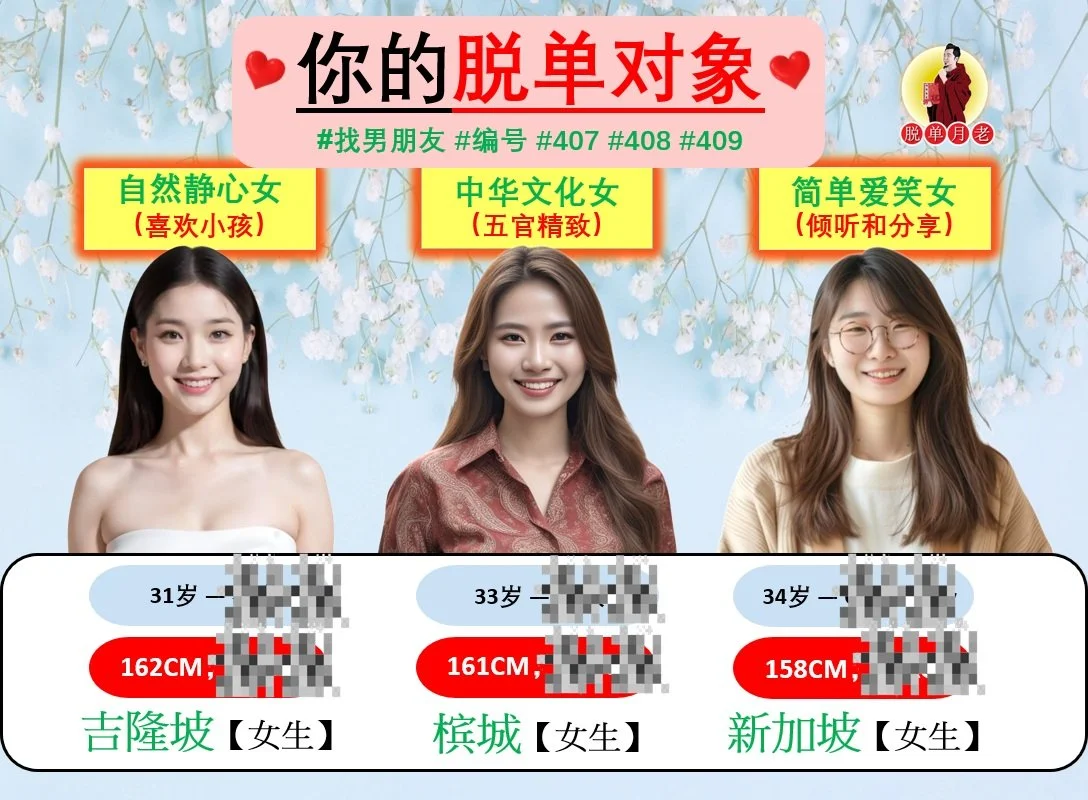 #编号412 #你的脱单对象 #马六甲 #娇小玲珑 #鼓励型女生 #找男伴侣 #43岁 #电子工程师