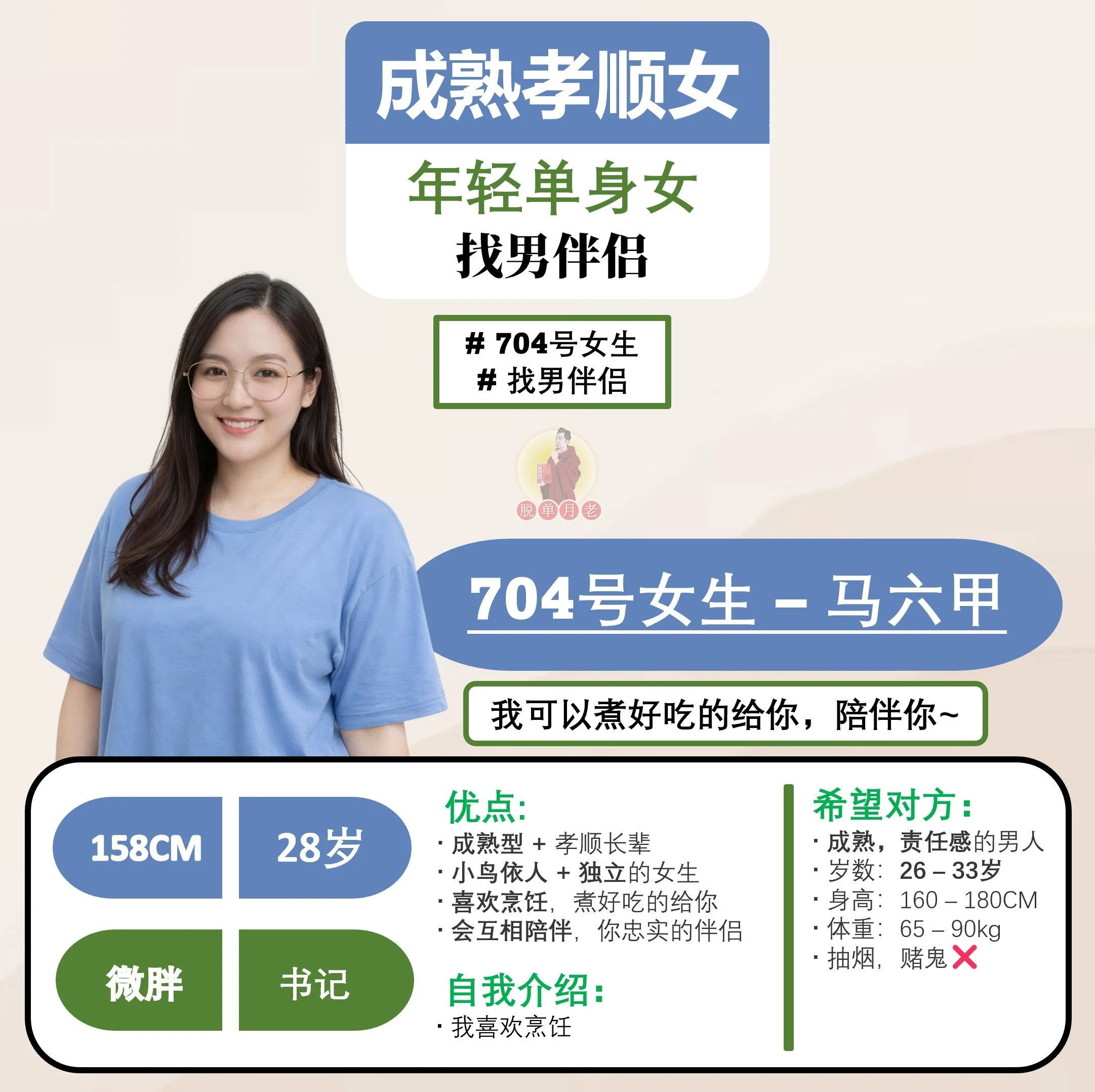 #脱单月老 #大马 #相亲公司 #交友脱单平台 #配对服务 #全西马 #编号704 #你的脱单对象 #年轻单身女 #马六甲 #成熟孝顺女 #找男伴侣 #28岁 #书记
