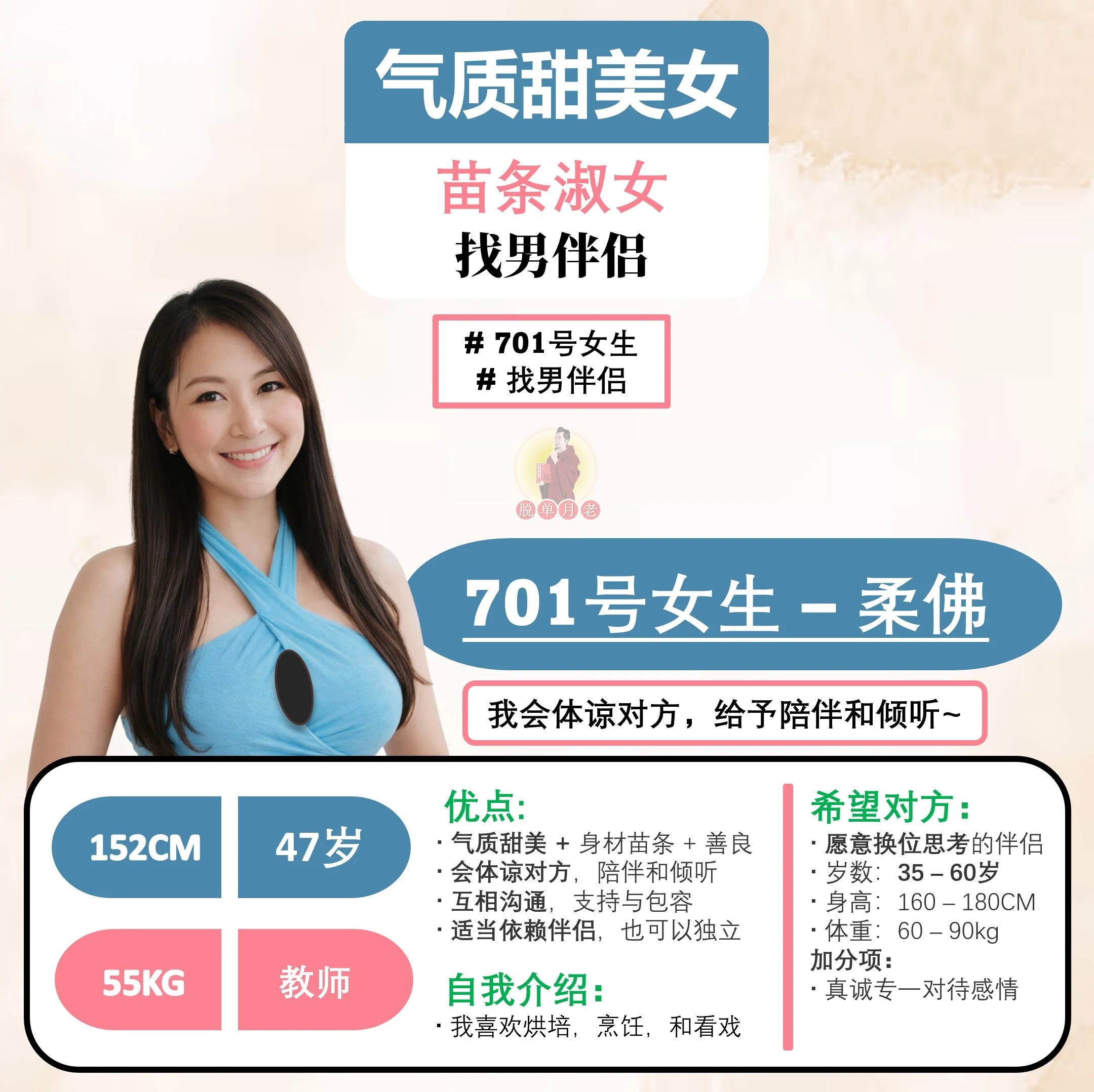 #脱单月老 #大马 #相亲公司 #交友脱单平台 #配对服务 #全马新 #编号701 #你的脱单对象 #优质美女 #柔佛州 #苗条淑女 #气质甜美女 #找男伴侣 #47岁 #教师
