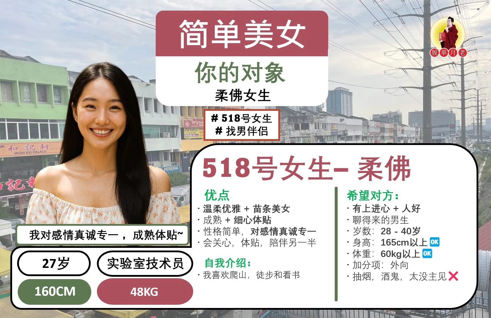 这位【柔佛州 - 气质甜美女】简介如下: